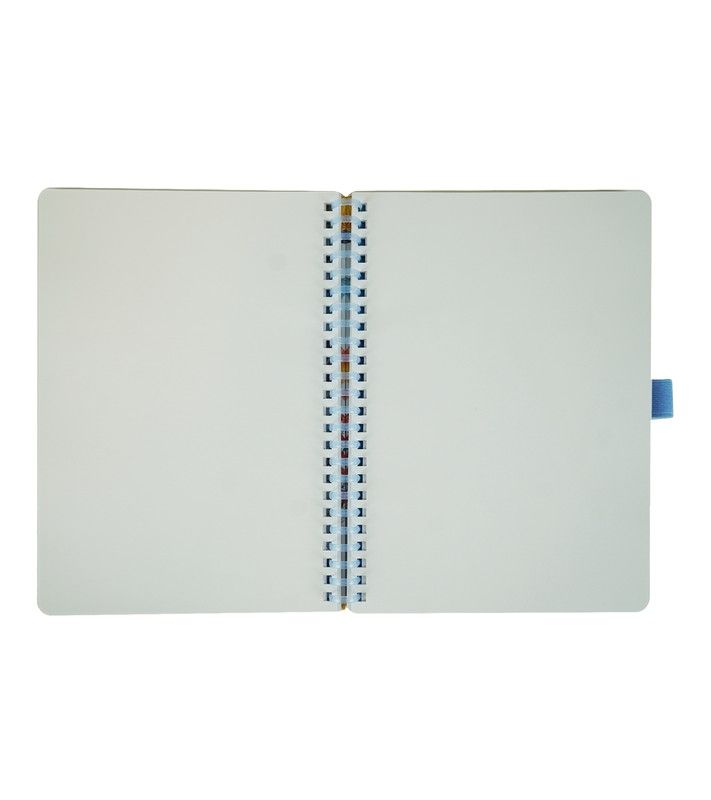 Caderno espiral de plástico, tamanho A5. 80 folhas lisas de 90gr. Fechamento com borracha. Bolso interno e porta-canetas.