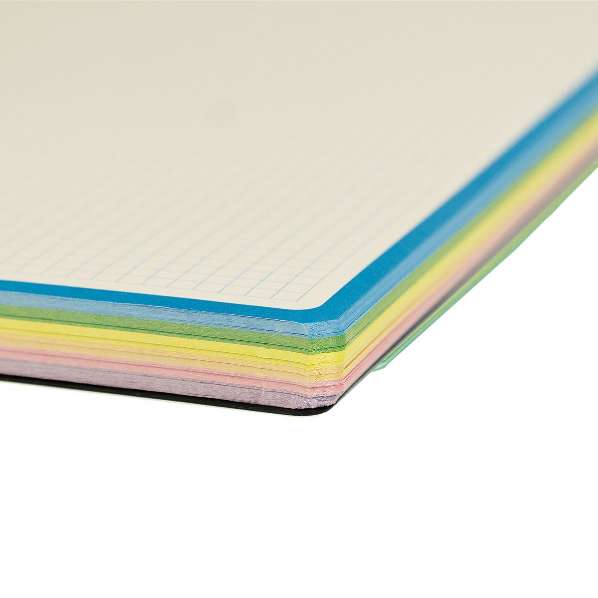 Bloco de notas em polipropileno microperfurado, com 150 folhas de 80g e grade 5x5 com 6 faixas coloridas. Certificado FSC.