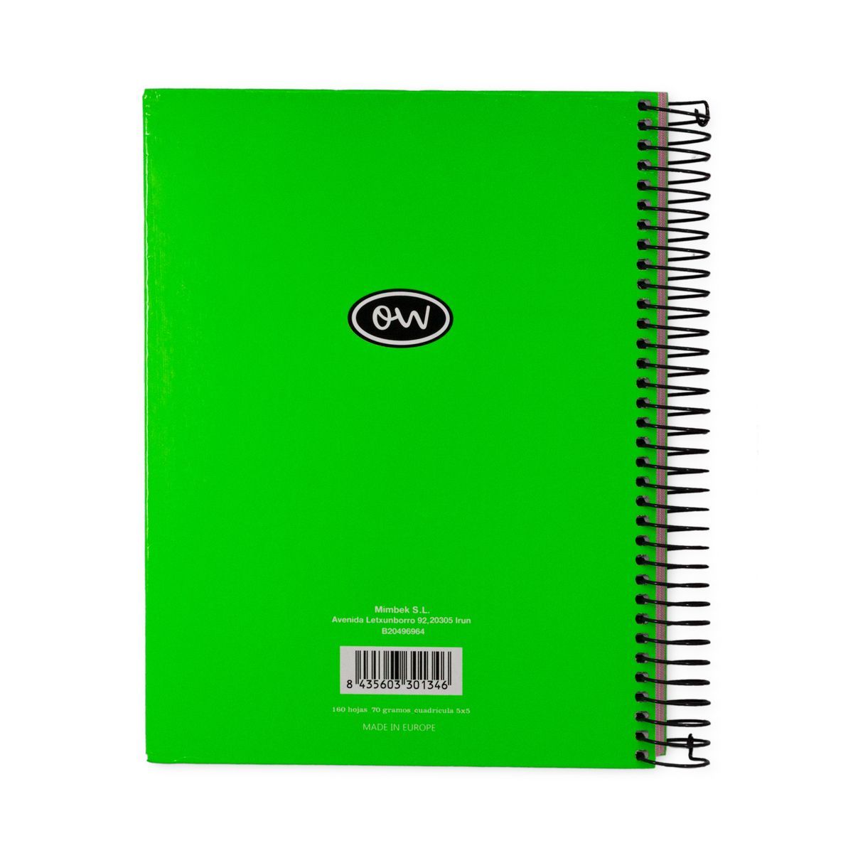 Caderno com capa extra dura microperfurada para poder arquivar as folhas em pastas. Cores neon variadas. Papel de 70 gramas com grade 5x5. Tamanho Din A-4 e 160 folhas