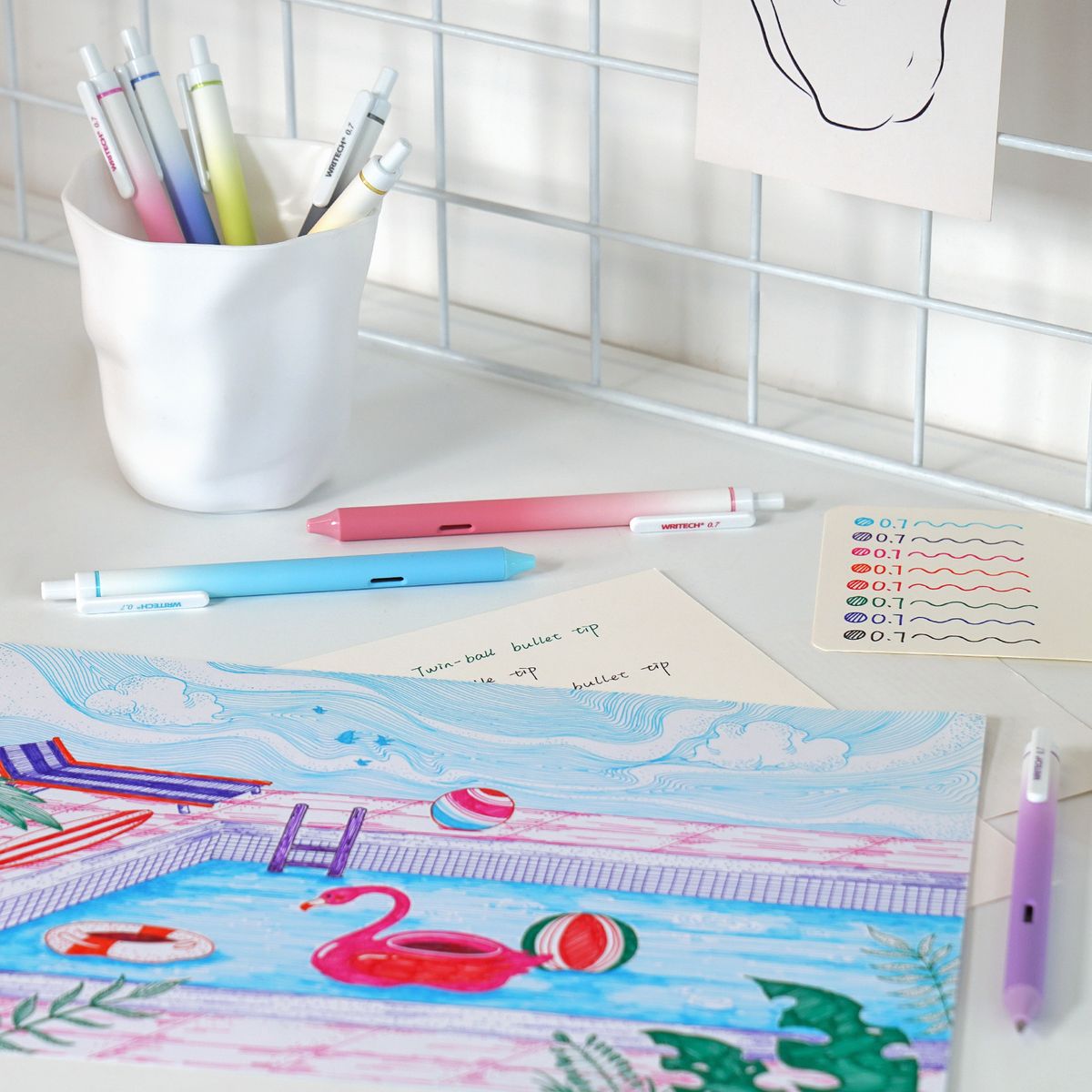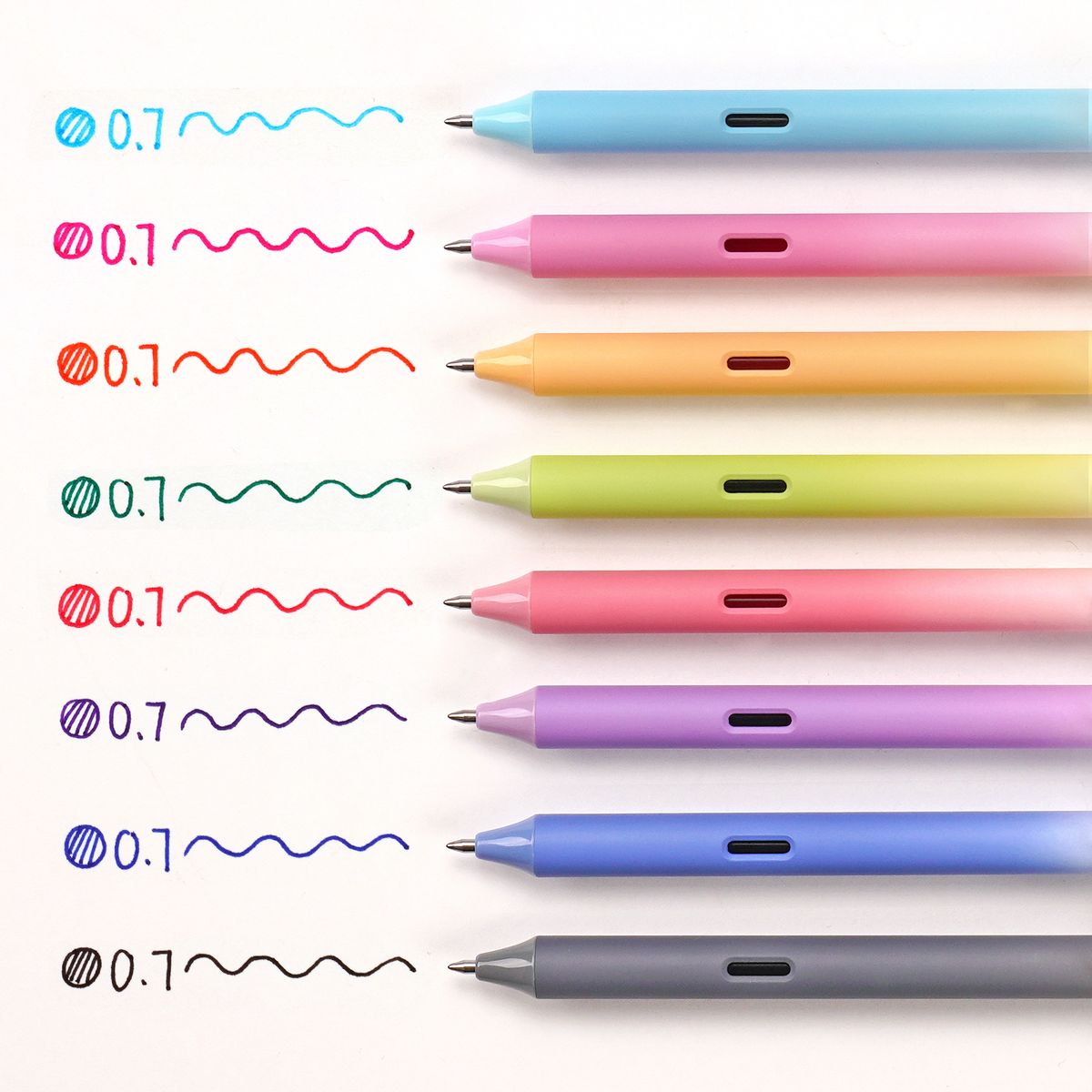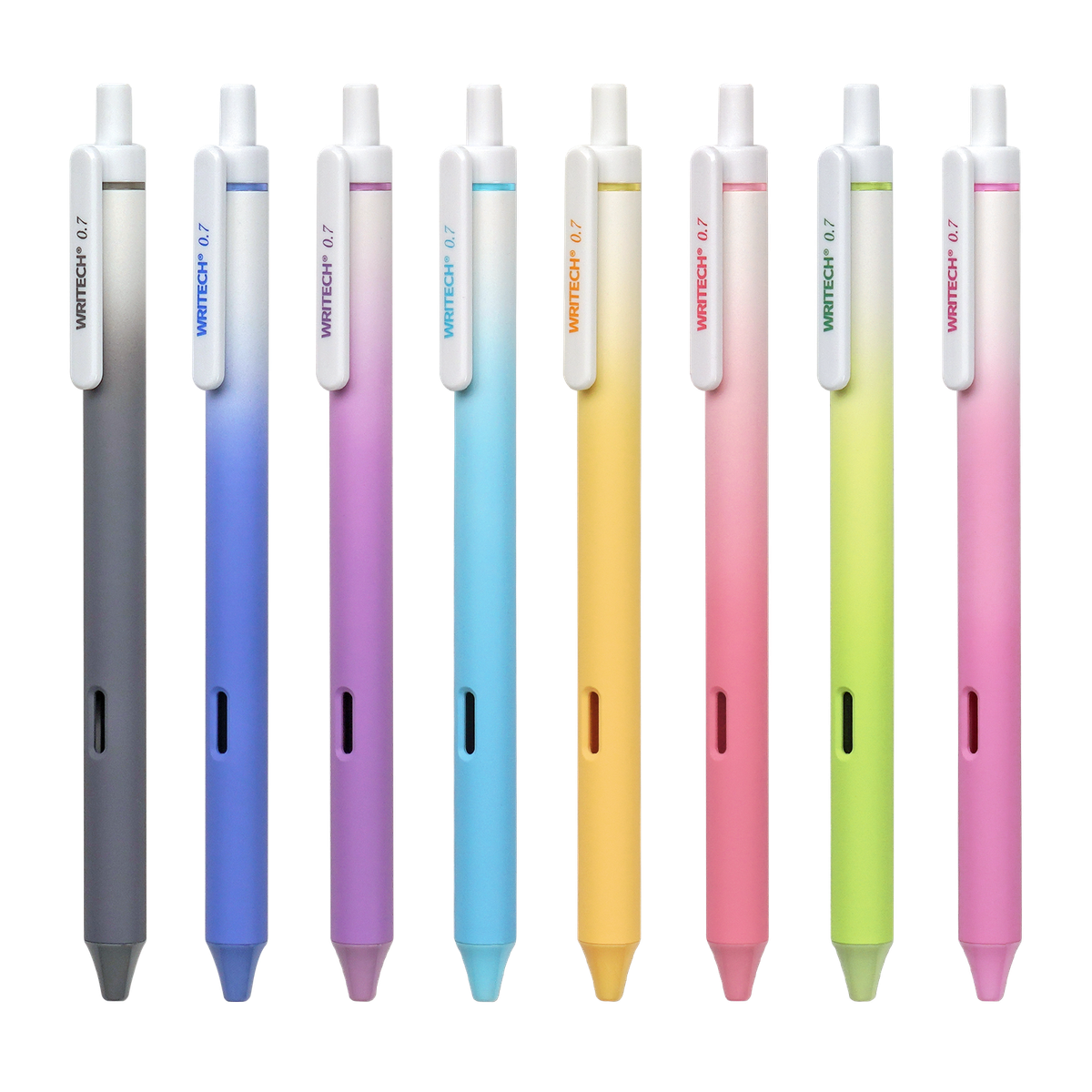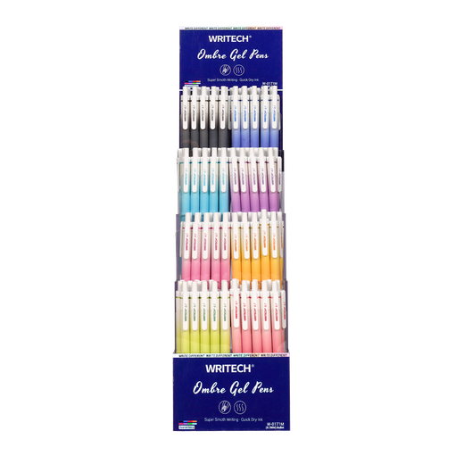 Bolígrafo retráctil de tinta de gel de secado rápido. Pulsador silencioso. Diseño ergonómico. Punta doble bola de 0,5mm. Contenido del expositor: 15 Bolígrafos en 8 colores de tinta diferentes.