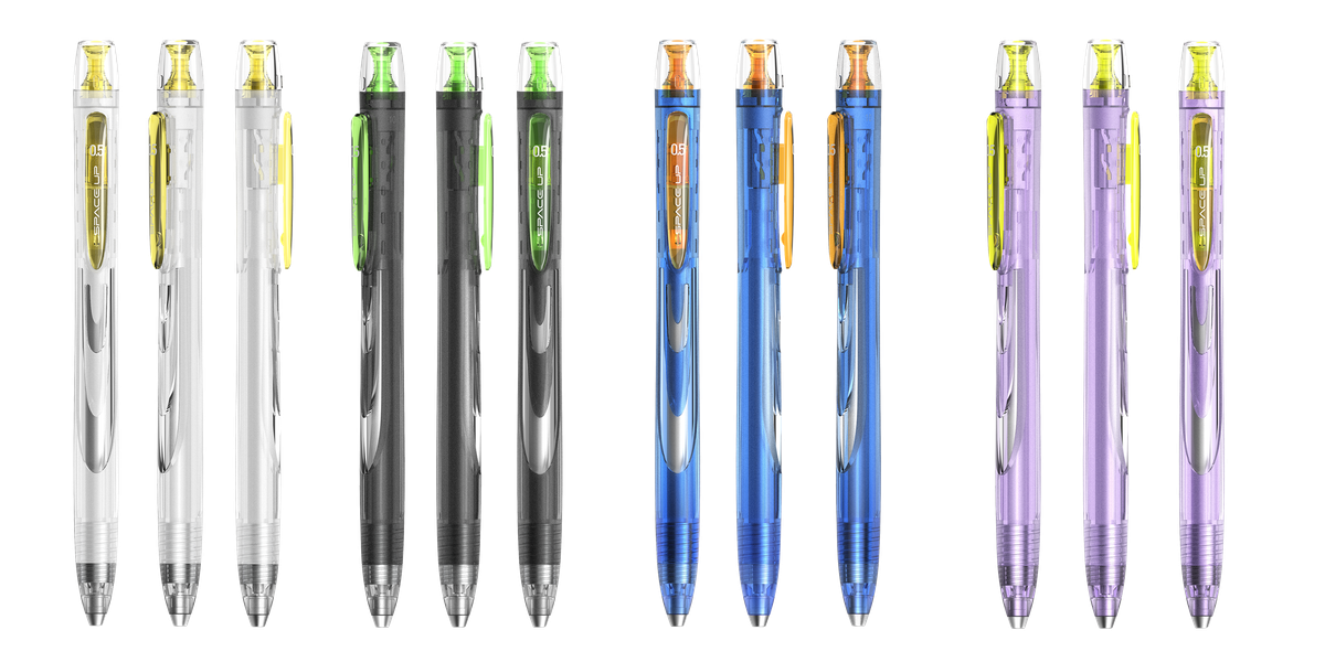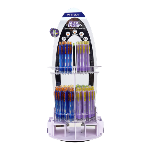 Bolígrafo retráctil de tinta de gel azul de secado rápido. Pulsador silencioso. Diseño ergonómico. Punta doble bola de 0,7mm. Contenido del expositor:24 Bolígrafos en 4 colores de cuerpo diferentes.