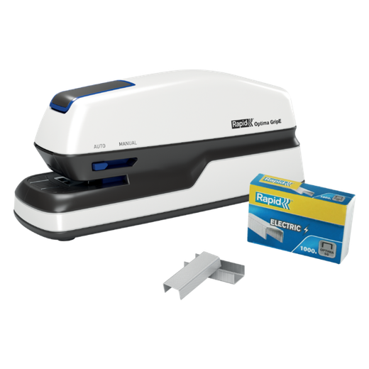 La grapadora eléctrica OPTIMA GripE de Rapid permite grapar sin dificultad hasta 20 hojas de papel a la vez (80 g/m²), ahorrando tiempo. Puede controlarse manualmente (empujando la tapa frontal) o de forma totalmente automática, ya que detecta cuándo se ha insertado el papel. Gracias a su tamaño compacto es ideal para escritorio o de mano. Esta máquina centra con precisión las grapas en el papel mediante la guía de colocación de grapas y garantiza un grapado sin atascos. Ideal para su uso en la oficina, áreas de recepción, mostradores de caja o en casa. Grapado higiénico gracias al uso sin contacto. Alimentación dual mediante adaptador (incluido) o 4 pilas AA (no incluidas). Se suministra con una caja de 1000 grapas Optima 56.
