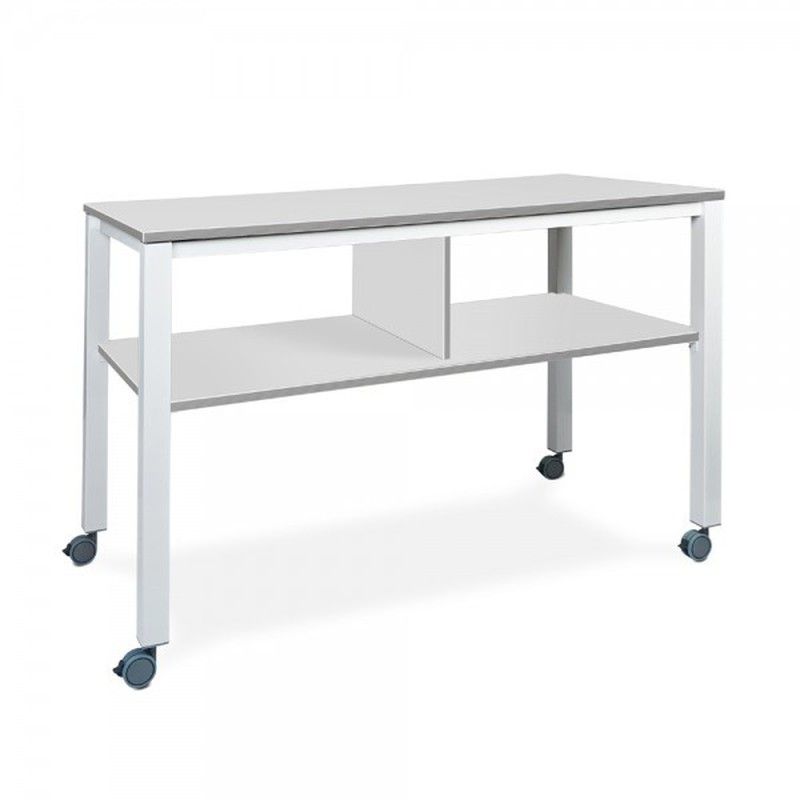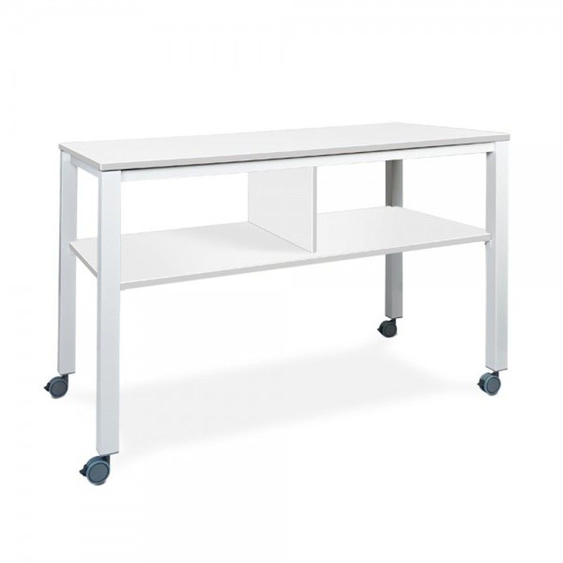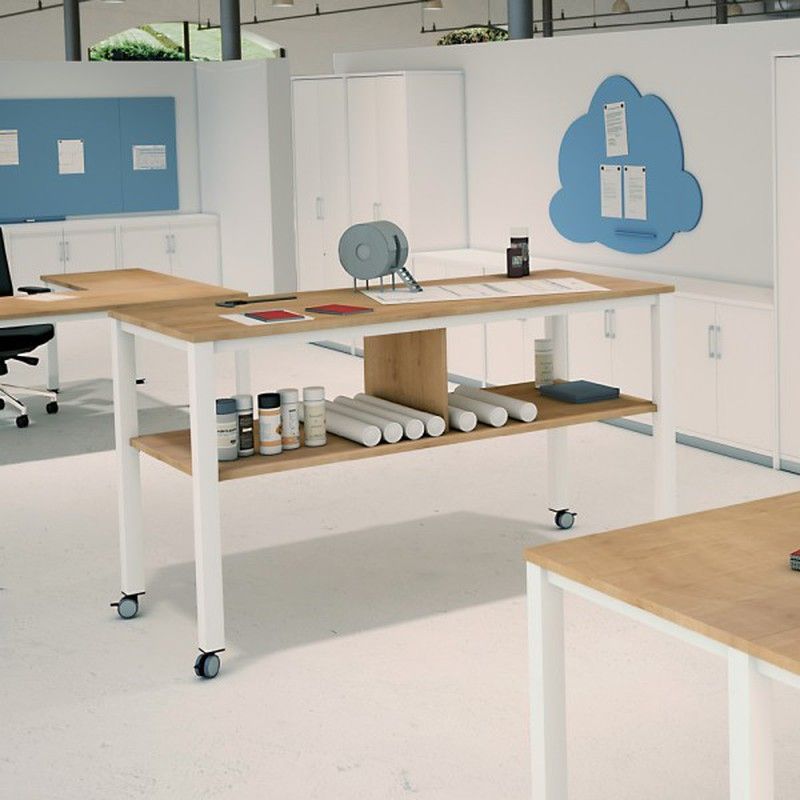 Mesa de trabalho muito funcional para todas aquelas ocupações e tarefas que devem ser feitas em pé. O nível inferior é perfeito para armazenar todos os itens que você deseja manter à mão. Versátil e confortável de usar, é uma mesa ideal para trabalhos individuais e em grupo. Como mesa de reunião, balcão etc no escritório ou na indústria. Estrutura metálica com rodas e madeira de faia ou carvalho. Medidas: 180x60cm. Variedade de cores e acabamentos que você pode combinar.