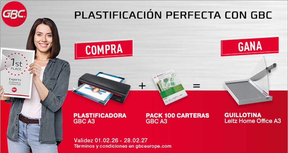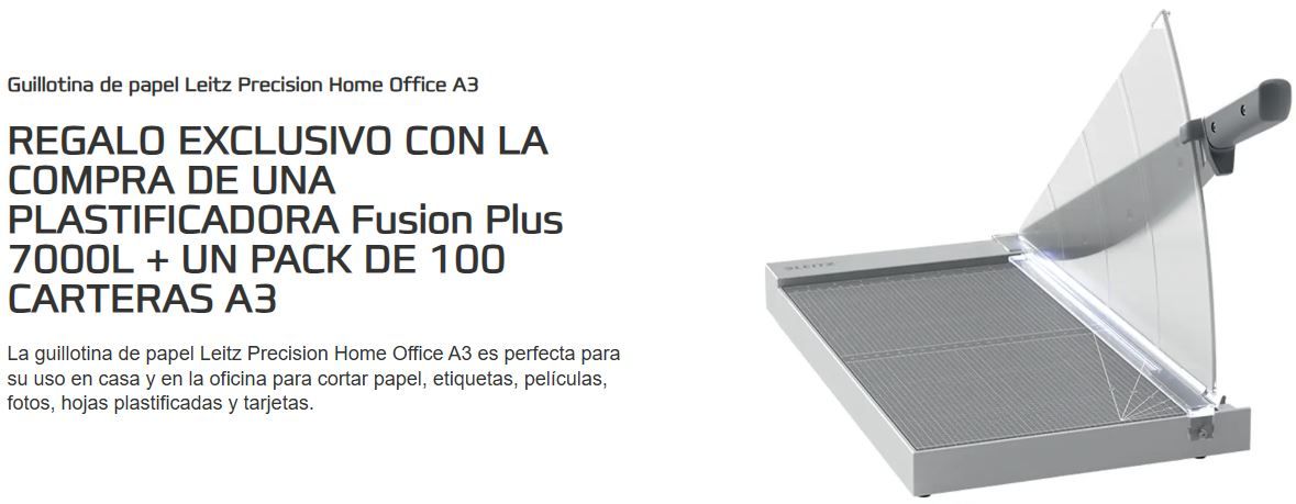 ¡NO TE PIERDAS ESTA PROMOCIÓN! Compra ahora este pack compuesto por una plastificadora GBC Fusion Plus 7000L A3 y una caja de 100 bolsas A3 de 125 micras para plastificar y recibe de regalo una estupenda guillotina Leitz Home Office A3 --- Sólo debes de registrar tu compra en https://www.gbceurope.com/es-es/promociones/plastificacion/ y recibirás en tu dirección tu regalo.