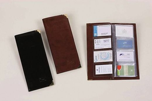 Porta-cartões de imitação de couro fixo. Contém 20 capas soldadas na lombada. 4 departamentos de cada lado. Com capacidade total para 160 cartões. Disponível nas cores preto e couro.