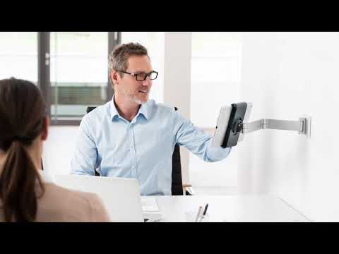 Adequado para todos os formatos de tablets de 7 a 13 polegadas. Fabricado em aço, alumínio e abs. Dimensões: 95 x 225 x 170 mm. Peso: 650 gramas. Ângulo do suporte: -6º a +46º; rotativo: 176º. Raio do braço: 365mm; faixa de rotação: 180º. Grande flexibilidade graças ao seu braço móvel. Ele pode ser girado 360°, permitindo que o tablet seja usado no formato retrato ou paisagem. Com ajuste de ângulo stepless. Dispositivo anti-roubo eficaz e bloqueio de suporte com uma chave especial.