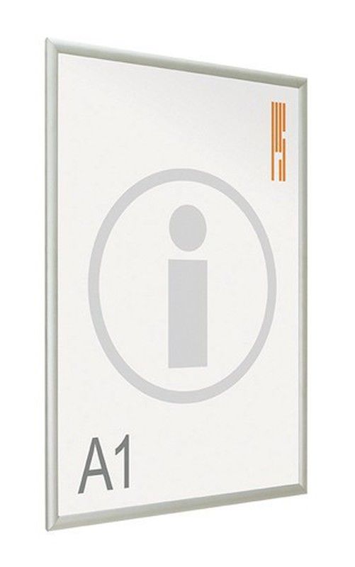 Suporte para pôster de parede com moldura fina dobrável. Fabricado em alumínio anodizado prata fosco. Cantos arredondados e esquadria que permitem a troca rápida e confortável do pôster. A tampa é uma folha de plástico antirreflexo transparente.