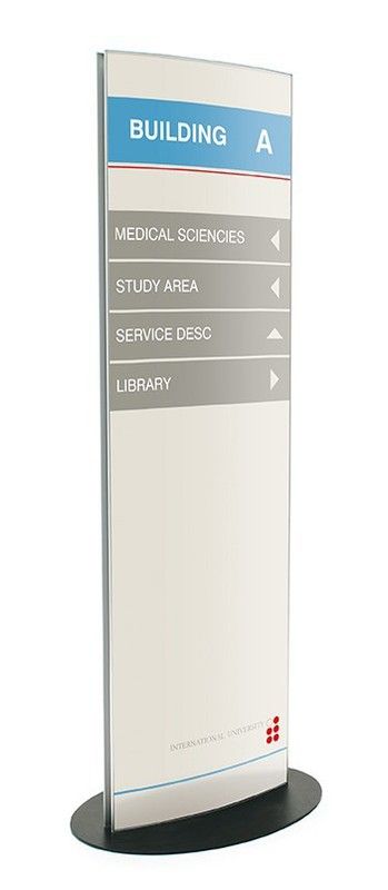 Totem de informação vertical de dupla face com perfil curvo. Estrutura em perfil de alumínio anodizado prata fosco. Eles são personalizados por impressão que está localizada sob o plástico protetor anti-reflexo transparente. Papel não incluído. Ventosa especial usada para levantar o plástico pela frente. A medida da base é 75 cm e o totem mede 60 cm de largura. Disponível em 2 tamanhos.