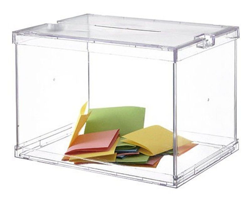 Urna de voto oficial de qualidade premium com base branca. Modelo dobrável com dois selos de segurança. O slot tem uma medida de 180x8 mm. e a urna tem 310 mm de profundidade x 440 mm de largura e 315 mm de altura. É feito de poliestireno transparente de alta qualidade com tampa resistente a choques.
